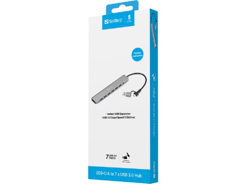 Sandberg USB-C/A to 7 x USB 3.0 Hub pruža maksimalnu slobodu povezivanja. Povežite do 7 USB-A uređaja kao što su eksterni hard diskovi, štampači, miševi i drugi periferni uređaji. Hub je kompatibilan sa modernim laptopovima sa USB-C, kao i sa starijim računarima sa USB-A.