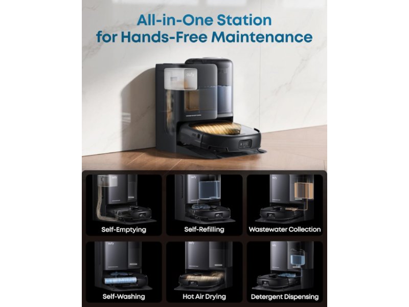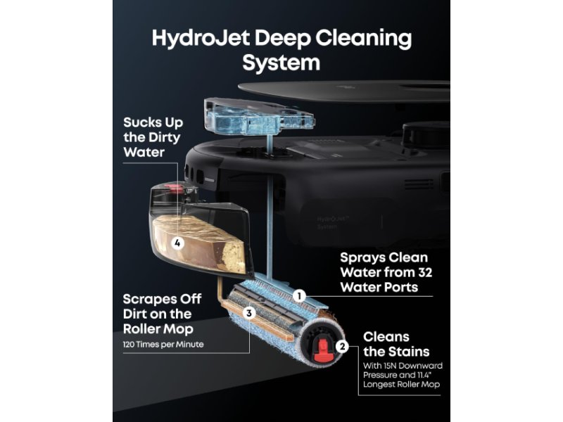 | Dotatne funkcije | Automatsko pražnjenje prašine Automatsko punjenje Glasovna kontrola Inteligentno izbegavanje prepreka Automatsko sušenje i čišćenje mopa u bazi Kontrole na dodir Automatsko doziranje tečnog deterdženta Mapiranje više spratova Pametna detekcija nečistoća Upravljanje pomoću aplikacije HydroJet tehnologija DuoSpiral tehnologija CornerRover tehnologija Zero-Tangle dizajn |