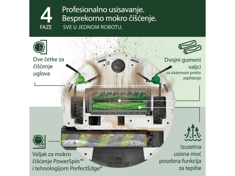 Putem aplikacije iRobot Home ili glasovnih komandi (Alexa, Siri, Google Assistant)**, možete jednostavno zakazati čišćenje, odabrati sobe, definisati zone ili kombinovati režime: samo usisavanje, samo brisanje, oba istovremeno ili “usisaj pa obriši”. Jedan klik – robot kreće, tvoja kuća, tvoje pravilo.