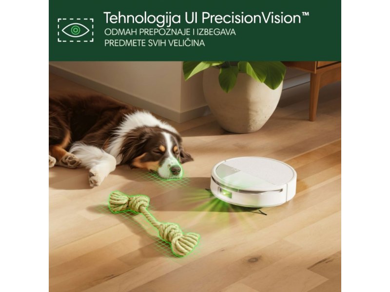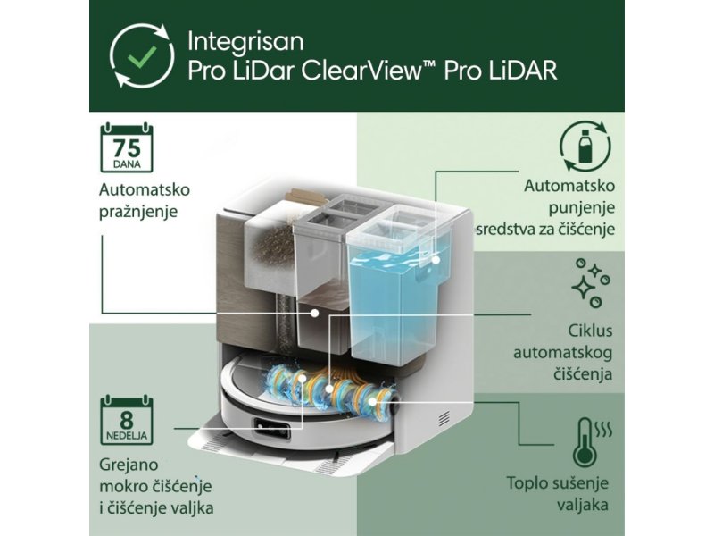Zahvaljujući naprednoj tehnologiji ClearView™ LiDAR + PrecisionVision™ AI, robot se precizno kreće, izbegava prepreke, prepoznaje nameštaj, kućne ljubimce i automatski podiže krpu kada detektuje tepih. SmartScrub funkcija briše napred-nazad za temeljno uklanjanje mrlja i prljavštine.