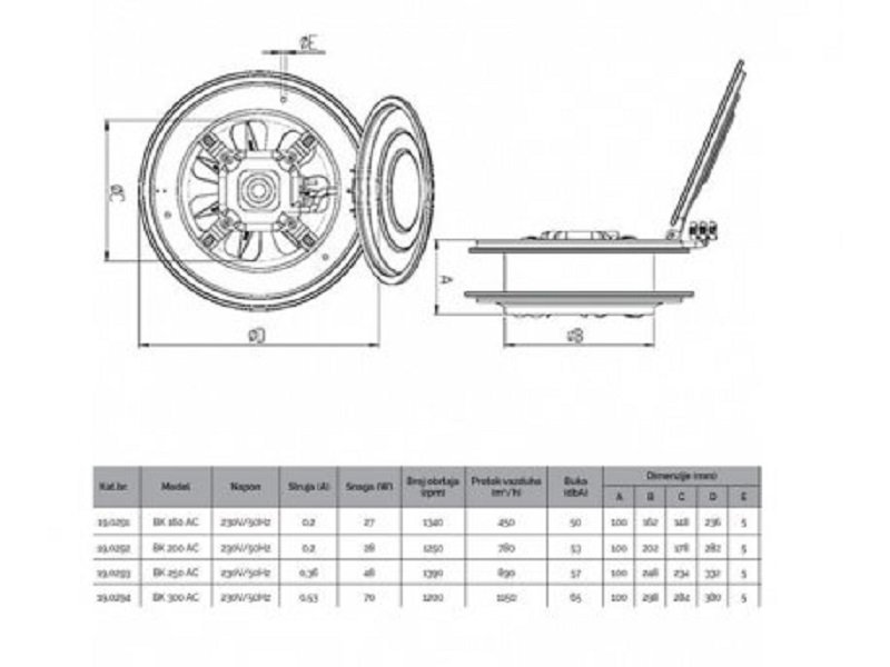 | Karakteristike | Model / Tip: BK 160 AC Nazivni Napon: 230/50 (V/HZ) Nazivna Struja: 0.2A Nazivna Snaga: 27 W Broj Obrtaja (R/Min): 1340 (r/min) Protok Vazduha (M3/H): 450 (m3/h) Buka (DbA): 50 db Težina (Kg): 1.8 IP Zaštita: IP 44 |