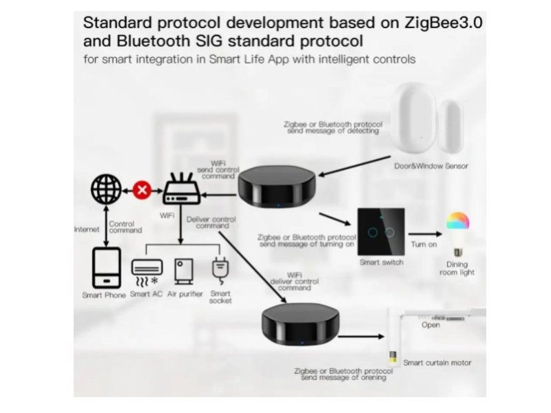 | Karakteristike | Model: ZIGBEE-GATEWAY-GW008 Gembird Tuya Zigbee Smart Gateway hub 3 In 1 Multimodal IR Remote Controller Voice Control Compatible with Alexa Google Nazivni napon: DC 5V Težina: 0,1 kg Udaljenost: 15m/100m(RF) Boja: Crna Bežicni standard: 802.11 b/g/n Bežicna frekvencija: 2,4 Ghz Radna temperatura: -15°-80° Prednost 1.Univerzalna IR kontrola za klima uredaj, TV, DVD plejer, audio itd. 2.Pametna kontrola mobilnih aplikacija sa 3G/4G/wifi sa bilo kog mesta. 3.Zamenite sve ostale daljinske upravljace sa 90000Plus IR kodom. 4. Automatski kodovi i FW se automatski ažuriraju. 5. Kontrola u realnom vremenu, kontrola vremena i daljinsko upravljanje. 6.Automatsko uskladivanje uredaja. 7.Pametna aplikacija za andorid i ios sistem. 8.Jedno dugme kontroliše jednu scenu sa mnogo opreme. |