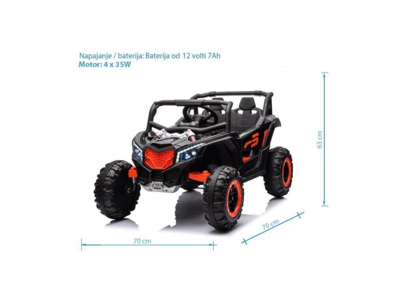 | Karakteristike | Tehničke specifikacije: • Pogon: 2 motora • Akumulator: 12V • Brzine: 2 (sporija i brža) • Kontrola: Pedala za gas + daljinski upravljač za roditelje (2.4G) • Maksimalna nosivost: 30 kg • Težina vozila: 14 kg Dimenzije vozila: • Dužina: 115 cm • Širina: 70 cm • Visina: 65 cm Funkcionalnosti: • Prednja svetla sa efektom realnih farova • Zvuk motora i sirena na volanu • AUX i USB ulazi za muziku • Sigurnosni pojas za dete • Daljinsko upravljanje za roditelje APACHE nudi autentično iskustvo vožnje zahvaljujući funkcionalnim prednjim svetlima, zvuku motora i sireni na volanu. Dete će se osećati kao pravi vozač dok upravlja volanom i koristi pedalu za gas, što čini svaku vožnju uzbudljivom i zabavnom.Ovaj model je opremljen sigurnosnim pojasem koji obezbeđuje bezbedno sedenje tokom vožnje. Pored toga, roditelji imaju potpunu kontrolu pomoću daljinskog upravljača (2.4G), što omogućava brzo reagovanje i upravljanje vozilom u svakom trenutku. Dve brzine – sporija i brža – pružaju mogućnost prilagođavanja vožnje uzrastu i veštinama deteta.Zahvaljujući ugrađenom muzičkom plejeru sa AUX i USB ulazima, mali vozači mogu slušati svoje omiljene pesme tokom vožnje. Zvuk motora i sirena dodatno pojačavaju utisak realne vožnje i donose sate zabave.Elegantna crna boja, sportske linije i detaljno izrađen izgled čine da APACHE izgleda kao pravi terenac. Moderan i moćan dizajn oduševiće svako dete i učiniti ga zvezdom svake vožnje. |