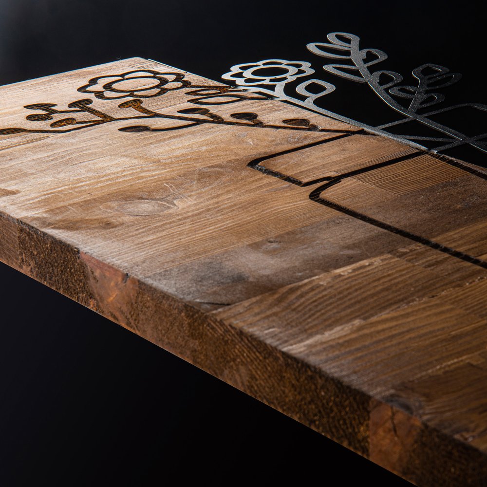 • Završna obrada: Mat crni metal sa finim, preciznim cvetnim detaljima; drveni okvir sa zaštitnim slojem laka koji ističe prirodnu teksturu drveta