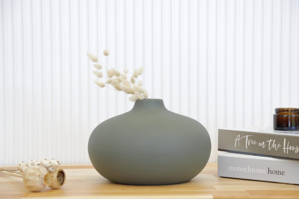 Zelena nijansa keramike ima prirodnu, zemljanu dubinu, koja podseća na smirenost i povezanost sa prirodom, dok mat završna obrada dodaje eleganciju i taktilnost. Zbog svog izražajnog izgleda, može se koristiti samostalno kao umetnički detalj ili u kombinaciji sa suvim biljkama, ukrasnim granama ili pampas travom.