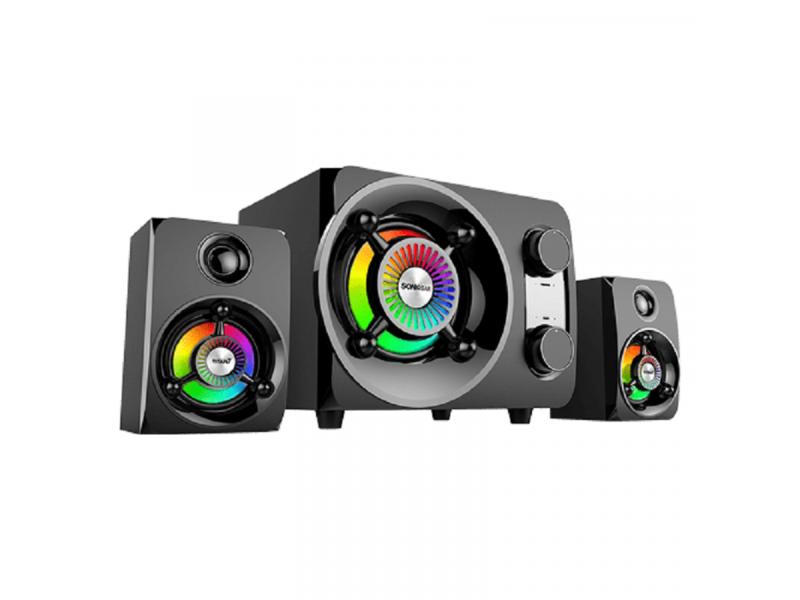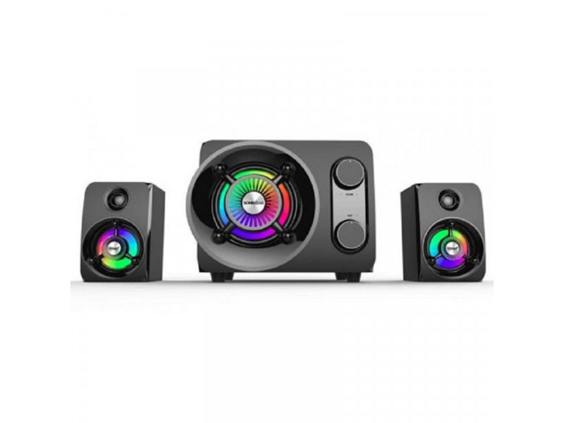 | Ostale karakteristike | Pojedinačna snaga zvučnika: Subwoofer: 15W Sateliti: 2x 5W Prečnik zvučnika (driver): Subwoofer: 5" Sateliti: 2x 3" Opseg frekvencija: 40Hz-200KHz/180Hz-20KHz Impedansa: 4 Ohm Bluetooth: Da Kontrole: Podešavanje jačine zvuka i bass-a LED pozadinsko osvetljenje sa 7 boja pulsirajućeg efekta FM Radio prijemnik Napajanje: Strujno |
